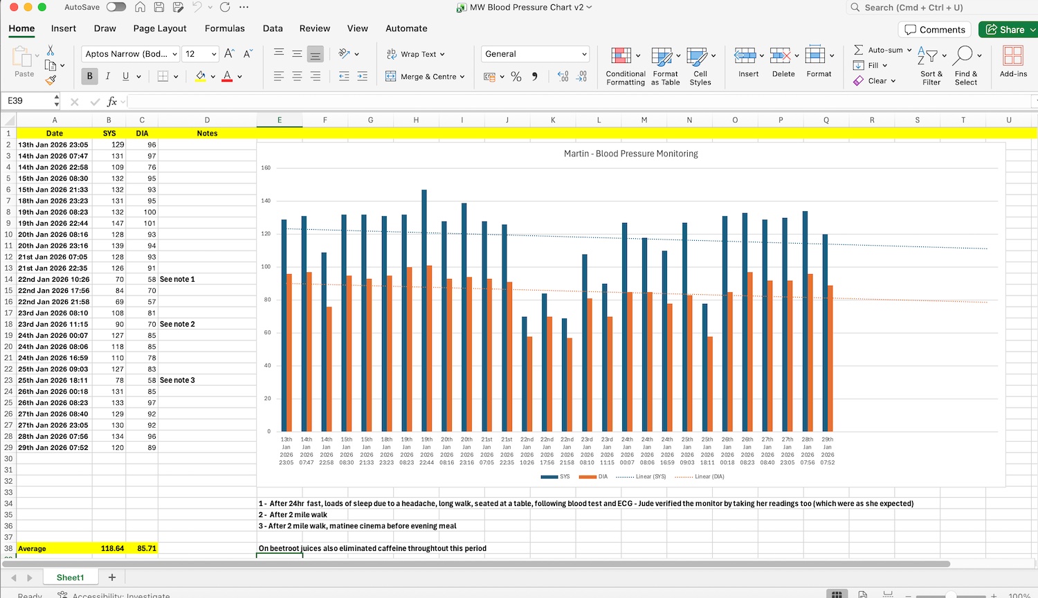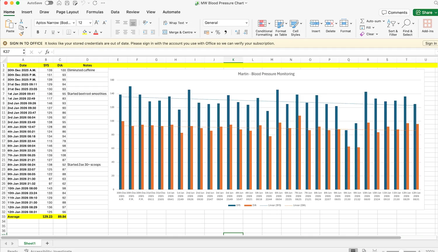 My first set of readings representing the period from 30th December 2025 to 12th January 2026 showing an average Systolic reading of 129.23 and an average Diastolic reading of 89.84.