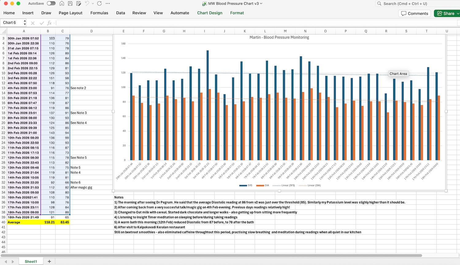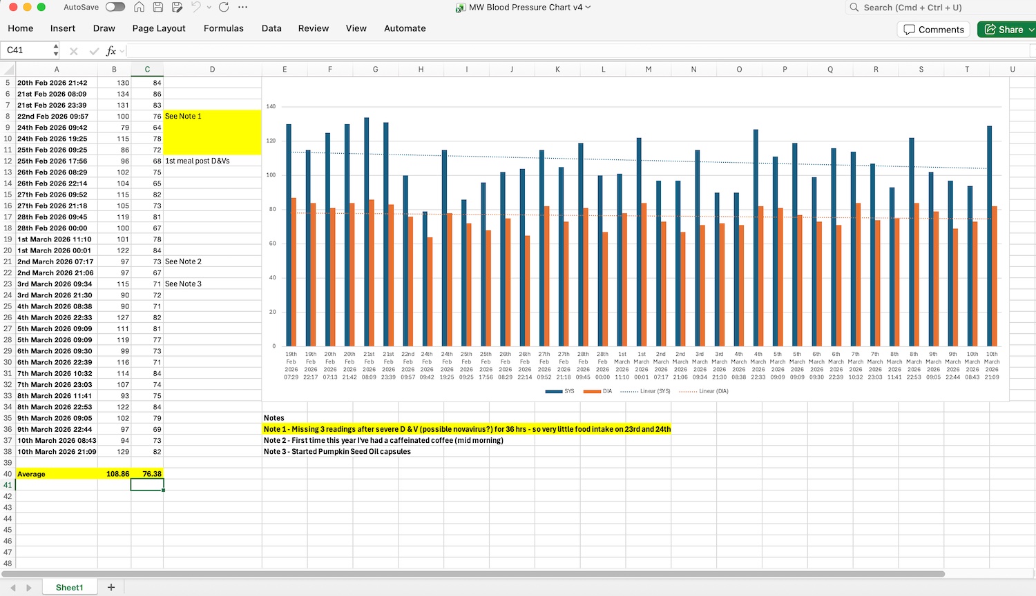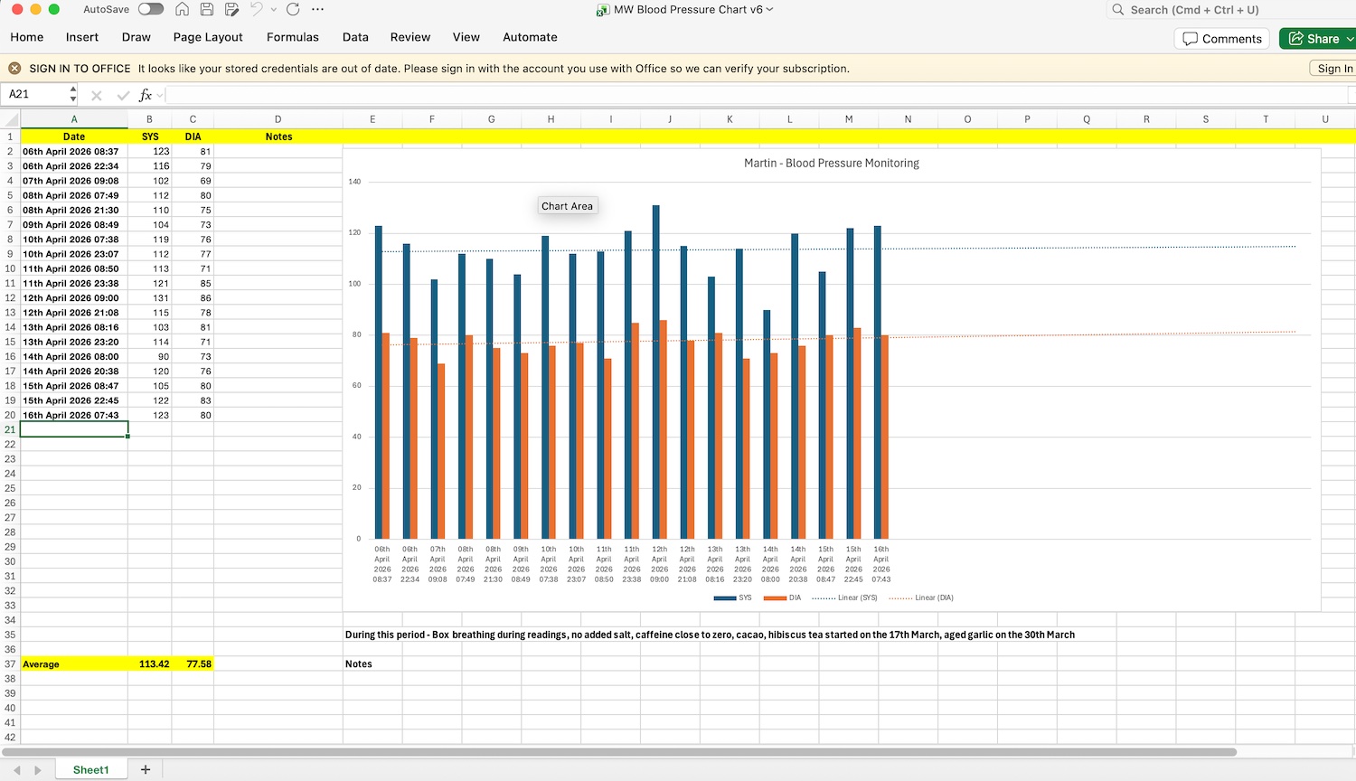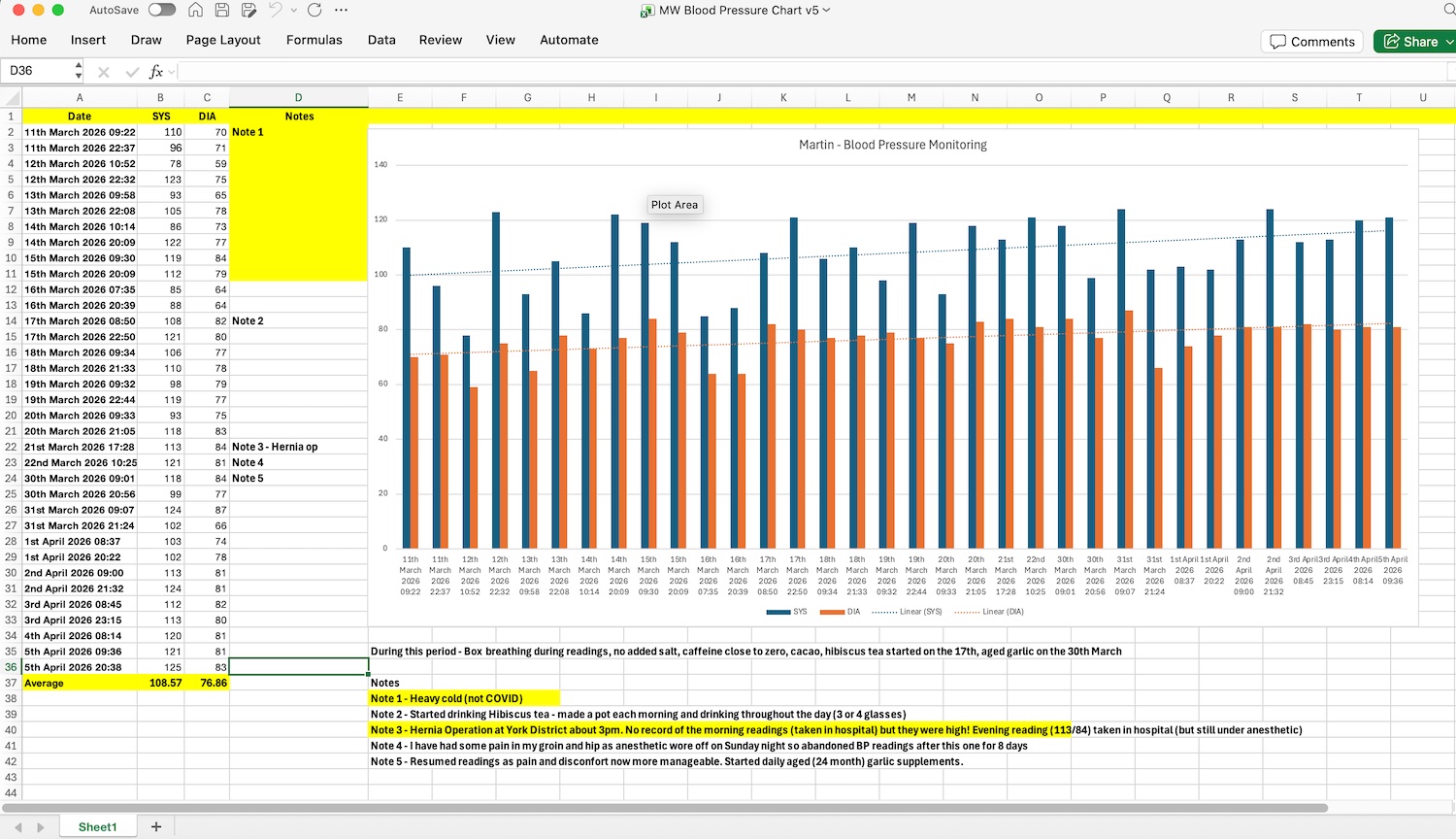 During this period - Box breathing during readings, no added salt, caffeine close to zero, cacao, hibiscus tea started on the 17th March, aged garlic on the 30th March